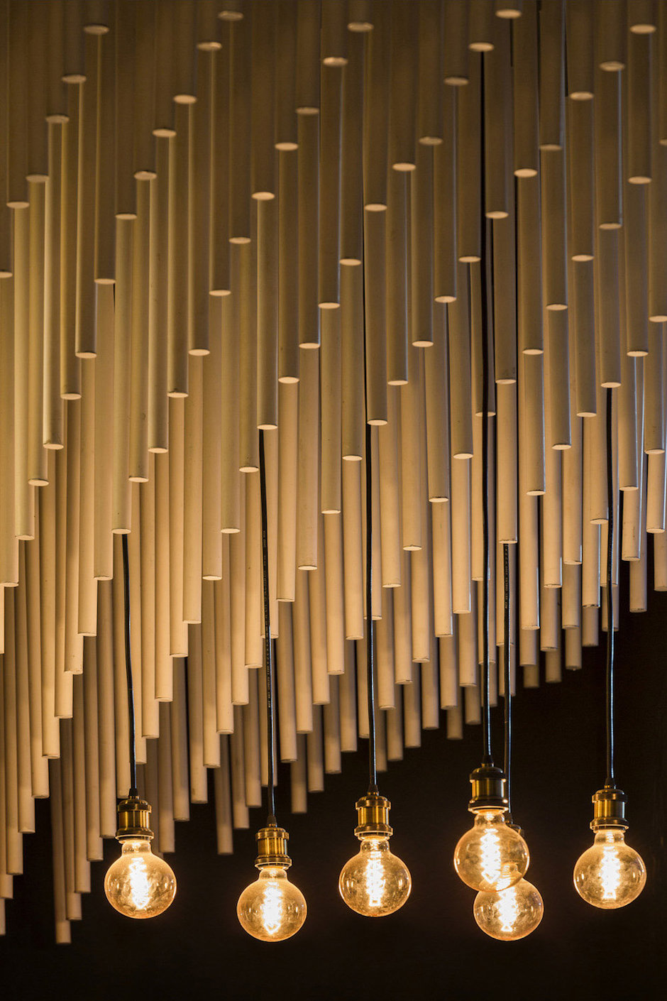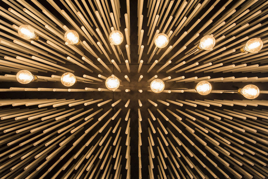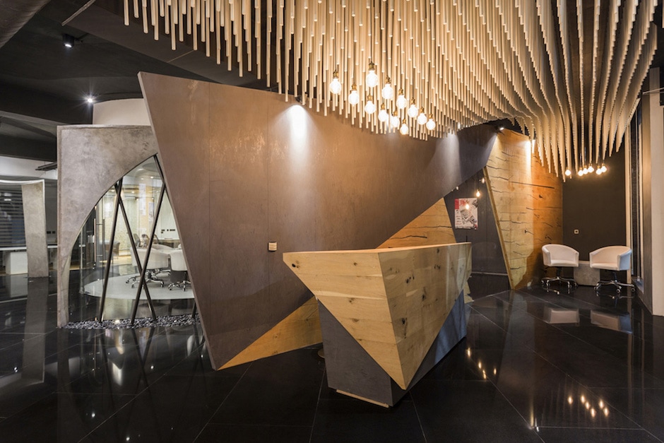 接待區(qū)的頂面裝置采用1500根圓桿制作成波浪般的立體造型,與幾何狀的接待臺(tái)在材質(zhì)上形成呼應(yīng),營(yíng)造出戲劇般的空間場(chǎng)景。
