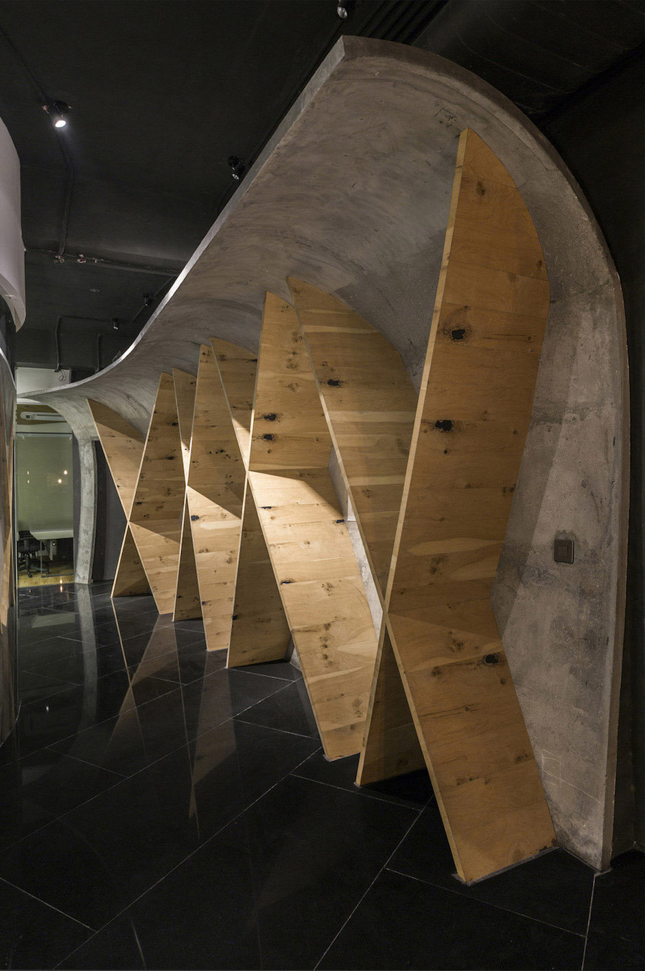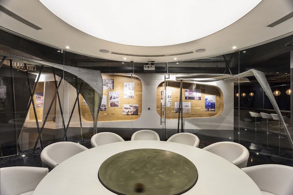 圍繞著圓形會(huì)議室的周邊是一些極為有趣的曲面空間構(gòu)造,采用特殊的施工工藝,呈現(xiàn)出豐富奇特的空間效果。所有這些裝置和元素都統(tǒng)一在暗調(diào)的鏡面般黑色花崗石地面中。