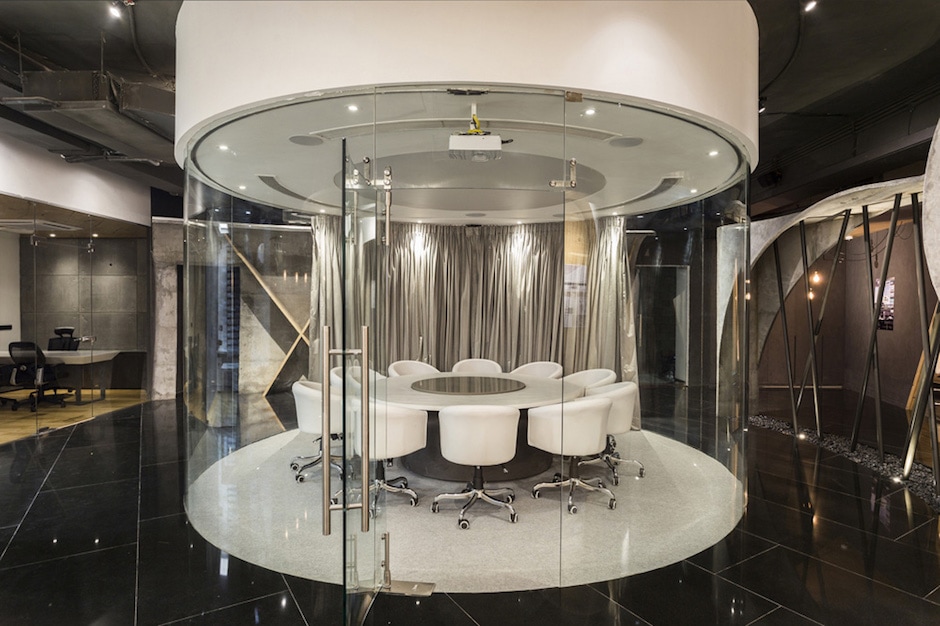 平面布局圍繞中心圓形會(huì)議室展開(kāi),直徑17英尺的圓柱狀會(huì)議室白色的頂、白色的地、白色的家具,在暗調(diào)環(huán)境的映襯下尤為醒目。