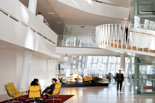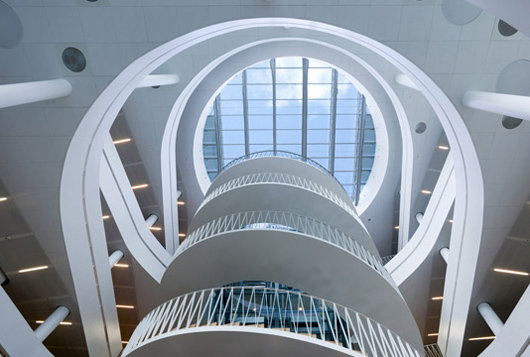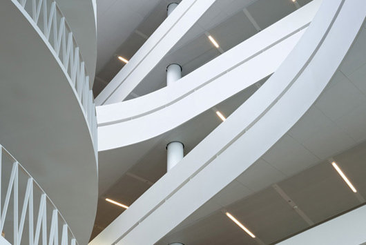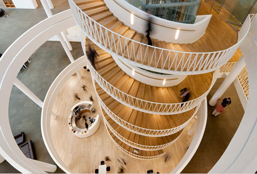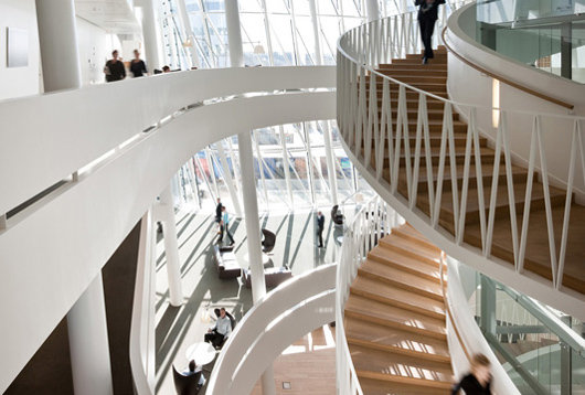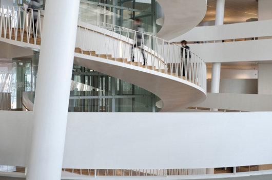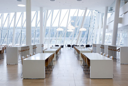 在2004年的國際設(shè)計競賽上,丹麥投資銀行Saxo將一等獎授予了3XN事務(wù)所。這家以通訊信息為基礎(chǔ)的銀行需要為其35個國籍的850名員工建造一座總部,反映其動態(tài)、開放、學(xué)習(xí)和展望未來的態(tài)度。因此,銀行總部更像是一座“學(xué)習(xí)環(huán)境”,要求設(shè)置分享知識的社交空間,并且足夠?qū)挻蟆?/p>