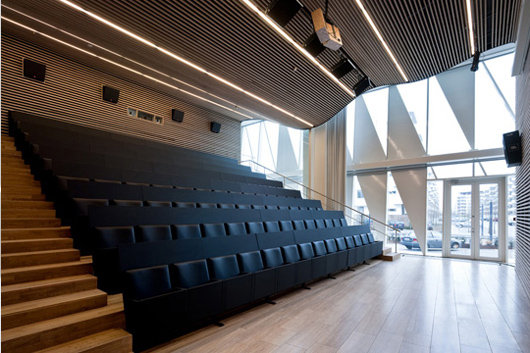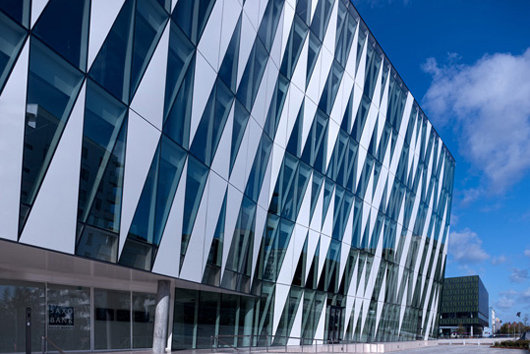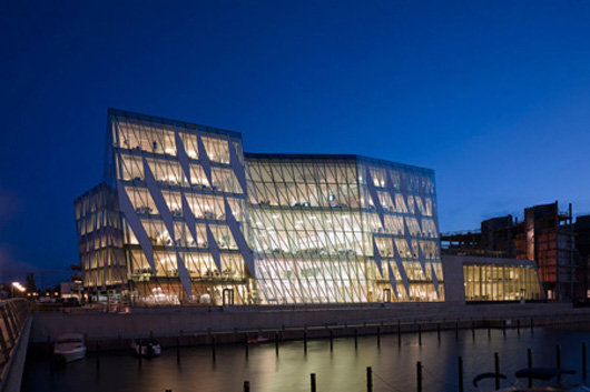 總部所在地原先是Tuborg釀酒廠的一部分,現(xiàn)在開發(fā)成Tuborg海港區(qū)。該項目主要的特點是建造了一條穿越場地的運河。沿著運河到底端,舊倉庫的木質(zhì)結(jié)構(gòu)面對著山形墻。